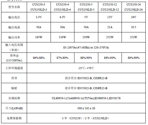 CUS250系列有2種版本(CUS250,CUS250LD),5種輸出型號(hào)(3.3V,4.2V,5V,12V,24V),于7月起接受訂單。