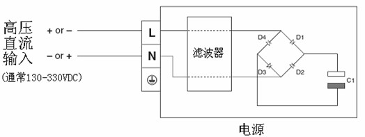 通過高壓直流電供電時,對于電源運行而言,連接的極性并不關鍵。如果在火線端連接正輸入,則 C1 通過二極管 D1 和 D3 充電。如果在中性線端連接正輸入,則 C1 通過二極管 D2 和 D4 來充電。