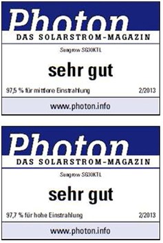 在最重要的轉換效率上,經過Photon在中等輻照和高輻照的條件下的測評,SG30kTL分別達到了97.5%,97.7%,最大效率達到98.3%; 歐洲效率和美國加州效率也高達98.1%。尤其是該產品的MPPT(最大功率點跟蹤)支持單、雙路的靈活配備,在最大程度上保證了較高的轉換效率,同時也 大大提升了系統設計與接入的靈活性,具有極高的性價比,“是Photon所測試逆變器中的頂尖機型”(Photon測評報告評價),已在中國、德國和西班 牙等全球多個國家得以成功應用。
