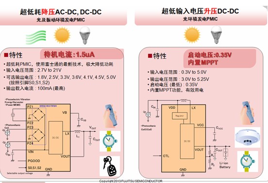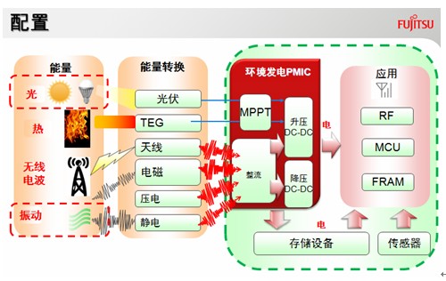 “事實上,微型能量收集并不是一個全新的概念,它之所以一直沒有被真正的廣泛應用的最大原因是其能量收集端所能收集到的能量和其實際能夠推動的能量消耗端所消耗的能量之間一直處于不平衡的狀態,簡單點說就是其收集的能量不夠用。可喜的是隨著傳感器、MCU、RF等器件功耗的不斷降低,以及微型能量收集電源管理IC技術的突破,使得系統能量收支逐漸趨于平衡。” 富士通半導體市場部高級經理王韻在展會現場介紹說。