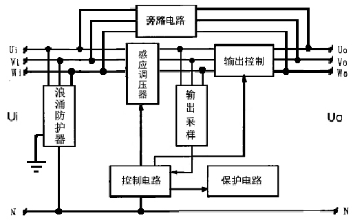 其工作過程為:當輸入電壓波動或負載變化時,通過輸出采樣電路獲取反饋電壓,經與基準電壓進行比較判斷,然后由控制電路輸出控制信號,控制感應調壓器工作,達到穩定輸出電壓的目的。同時,控制電路還對保護電路和輸出控制電路進行控制,產生相應的動作。