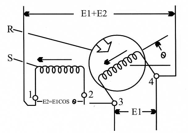 感應調壓器的主要構件為轉子R和定子S(如下圖所示)。轉子繞組為一次繞組,與電網并聯;定子繞組為二次繞組,與負載串聯。當3-4間加電網電壓E1時,二次繞組感應的電壓E2隨兩繞組交角Θ的變動而變化,E2=E1*COSΘ。改變一次、二次繞組的電角度,就可以連續改變輸出電壓。