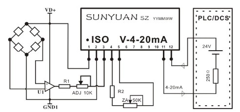 新品:用PLC/DCS回路中的信號給電橋電路供配電壓信號 ISO V-4-20mA應用圖