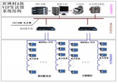 由于該項目是五星級酒店,現場需要監測所有安裝智能儀表的回路,并且需對空調、照明、動力用電進行分類統計,并且該統計報表需每天自動生成,現場設備運行狀態包括回路合分閘狀態也需實時顯示。現場儀表眾多,采用了3個串口服務器加交換機的組網方式。