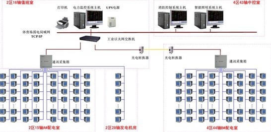 根據(jù)實(shí)際需求,為提高整個(gè)弱電系統(tǒng)集成度,位于43軸中控室的消防和智能照明系統(tǒng)主機(jī)均可通過體育場弱電局域網(wǎng)遠(yuǎn)程連接本系統(tǒng)以獲得配電系統(tǒng)的實(shí)時(shí)數(shù)據(jù)。