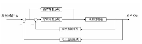 當(dāng)作為弱電系統(tǒng)的一個(gè)子系統(tǒng)與其他系統(tǒng)協(xié)同工作時(shí),本系統(tǒng)位于體育場弱電系統(tǒng)的反饋環(huán)節(jié)上,和智能照明系統(tǒng)以及消控系統(tǒng)組成一個(gè)整體,保障比賽期間體育場用電平衡和安全。比賽時(shí)所有照明回路由智能照明系統(tǒng)通過體育場各照明箱內(nèi)的ABB智能模塊控制;消控系統(tǒng)負(fù)責(zé)體育場各區(qū)域電氣回路總開關(guān)的遙控;電力控制系統(tǒng)主要為其他兩個(gè)系統(tǒng)提供數(shù)據(jù)支撐,輔助智能照明系統(tǒng)維持照明回路三相平衡,必要時(shí)消控系統(tǒng)切斷部分次要回路以降低變壓器的壓力。