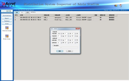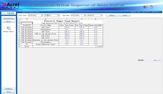 根據(jù)設(shè)計(jì)意圖,在體育場的低壓配電系統(tǒng)中,商鋪和舞臺演出部分都需要做電能計(jì)量,要求電力監(jiān)控系統(tǒng)能具有一定的電能管理功能。本系統(tǒng)提供給客戶一個(gè)能查詢電能報(bào)表并打印的界面,提供用戶查詢時(shí)間的自定義選擇然后生成電度計(jì)量報(bào)表,完成對進(jìn)線回路、商鋪回路和演出回路的電度計(jì)量。