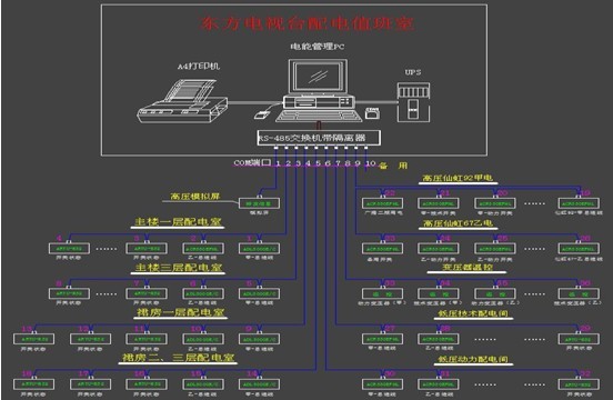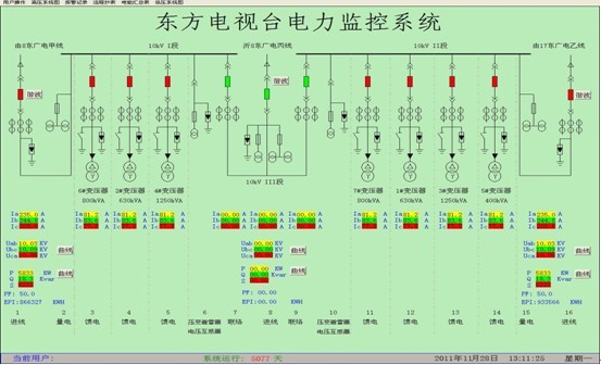 在世博會前上海東方電視臺配電系統基本還是使用90年代初期建臺時的設備,配電柜中安裝的儀表都是機械式電度表、電流指針表和電壓指針表。配電模擬屏為靜態(tài)式,各配出回路狀態(tài)靠人工手動調節(jié)。整個配電網絡的運行狀態(tài)和參數基本上是人工定時檢查抄錄模式,配電故障的可預見性差,事故后的原因追溯分析比較困難。這些情況與上海國際化大都市、東方臺在國民經濟和生活中的重要地位以及配電系統智能化的趨勢都是極不匹配的。為了確保上海世博會期間東方電視臺電力的安全可靠供給,電視節(jié)目的可靠轉播,對臺內原有老配電系統的升級改造變的勢在必行。通過電視臺的公開招標,安科瑞電氣以其穩(wěn)定可靠的Acrel-2000電力監(jiān)控系統解決方案成功中標。