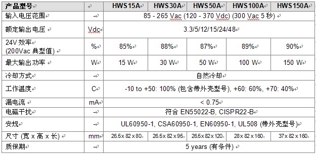 主要數據:HWS-A系列(15,30,50,100,150W)