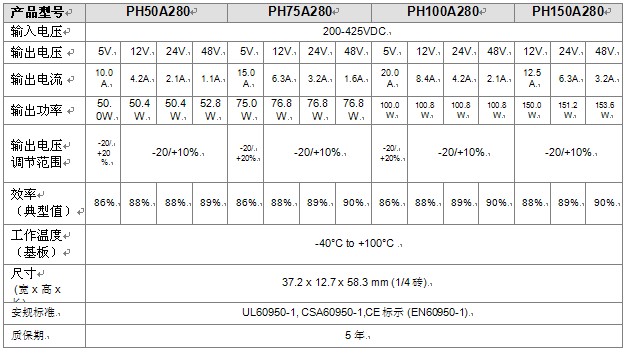 PH-A280系列由非常成功和知名的PH-S280/PH-F280系列而來,尺寸縮小50%,效率提升5%(最高90%)。除了這些重大的改進外,輸入電壓上限也擴展到425VDC.