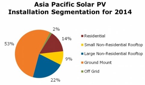 2014年地面安裝太陽能光伏項目將主導(dǎo)亞太地區(qū),占裝機容量的53%。住宅和小型商業(yè)屋頂將占該區(qū)域市場的不足四分之一。