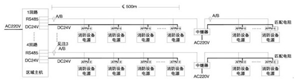 傳輸距離大于500m時,需加中繼器,1合中繼器占用1個傳感器(監控模塊)地址,中繼器的AC220V電源線采用3*1.5mm^2,由現場消防電源或消防監控室監控器(主機)提供。