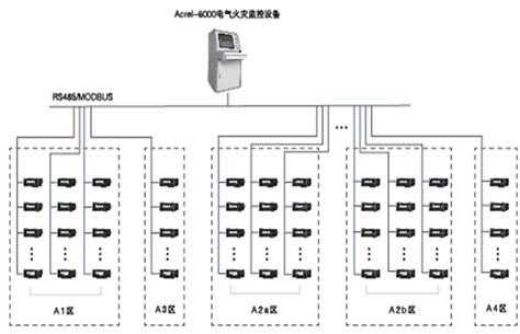 Acrel-6000電氣火災監控系統采用分層分布、開放式結構設計,由站控管理層、網絡通訊層和現場設備層組成。各電氣火災監控探測器通過屏蔽雙絞線RS485接口,采用MODBUS通訊協議總線型連接接入通訊服務器,然后通過五類線TCP/TP協議進入工業交換機,然后通過光纜到達監控主機。
