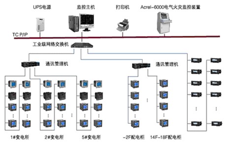 Acrel-6000電氣火災(zāi)監(jiān)控系統(tǒng)采用分層分布、開放式結(jié)構(gòu)設(shè)計(jì),由站控管理層、網(wǎng)絡(luò)通訊層和現(xiàn)場(chǎng)設(shè)備層組成。各電氣火災(zāi)監(jiān)控探測(cè)器通過屏蔽雙絞線RS485接口,采用MODBUS通訊協(xié)議總線型連接接入通訊服務(wù)器,然后通過五類線TCP/TP協(xié)議進(jìn)入工業(yè)交換機(jī),然后通過光纜到達(dá)監(jiān)控主機(jī)。