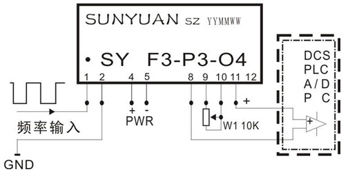 輸入:0~10KHZ/3~10V的脈沖頻率信號; 輸出:0~5V DC模擬信號。