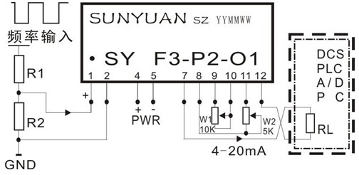 1、輸入為0-xHz輸出為4-20mA模擬電流信號時須同時外接增益調節電位器和零點調節電位器。