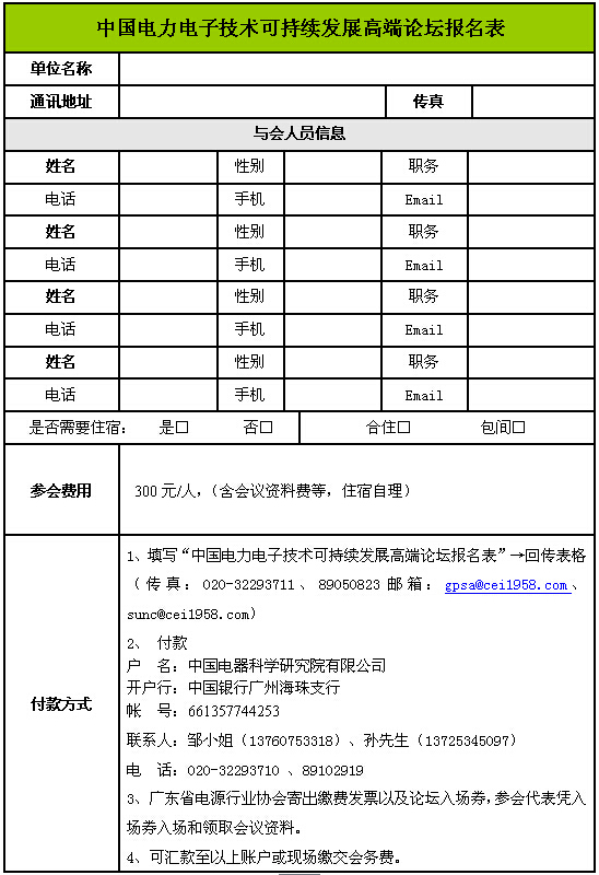 附件1:中國電力電子技術可持續發展高端論壇報名表