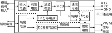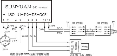 應用2:將傳感器、變送器輸出的模擬信號隔離轉換成PWM信號,用CAN總線模塊進行遠程無失真傳輸。