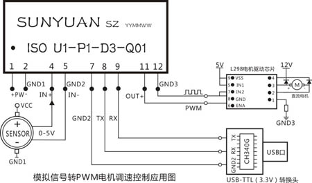 應用3:將傳感器、變送器輸出的模擬信號隔離轉換成PWM信號,用來調控直流電機轉速。