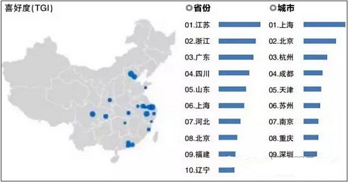 從地區來看,江蘇、浙江、廣東三省以及北京、上海等一線市場成為照明產品關注聚集地,占到38.8%,而四川(5.72%)、河北(4.2%)、河南(3.33%)、安徽(3.51%)、湖南(2.94%)、河南(3.33%)、山西(2.68%)、云南(2.14%)等內陸省份成為三四線市場集結地,占據35%左右份額
