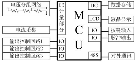 宿舍安全用電智能管理終端采用專用功能的微控制單元(Micro Control Unit,MCU)設計。整機的硬件系統實現依據各個功能模塊而展開,包含微處理器、電阻分壓網絡電壓采樣、電流互感器電流采樣、三路磁保持繼電器控制輸出、鐵電數據存儲、液晶顯示、按鍵輸入、有功電能脈沖指示輸出等。硬件組成如圖1所示。