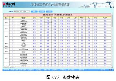 參數抄表功能,主要對低壓各出線回路的電參數進線查詢。支持任意時刻電參數查詢,具備數據導出和報表打印等功能。該報表查詢供一個變電所和樓層進出線各低壓回路的電參數,主要包括:三相電流、有功功率和有功電度及變壓器溫度。該報表各回路名稱和數據庫關聯,方便用戶修改回路名稱。見圖(7)。