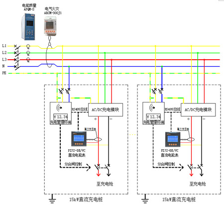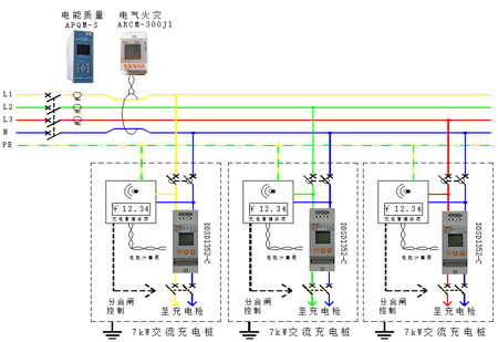 交流充電樁一般功率在7kW左右,總進(jìn)線回路配置電能質(zhì)量分析儀,對(duì)整個(gè)充電樁供電回路電能質(zhì)量進(jìn)行監(jiān)測(cè)。進(jìn)線回路同時(shí)設(shè)置電氣火災(zāi)監(jiān)控裝置,充電管理控制器,負(fù)責(zé)充電計(jì)費(fèi)控制;單相導(dǎo)軌式交流電能表,用于充電電能計(jì)量,電能數(shù)據(jù)由充電管理控制器通過RS485通訊口讀取;進(jìn)線側(cè)配置帶漏電保護(hù)斷路器;充電側(cè)配置帶電操微型斷路器等。