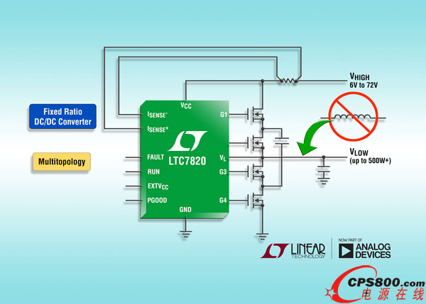 2017年6月20日,亞德諾半導體(AnalogDevices,Inc.,簡稱ADI)旗下凌力爾特公司(LinearTechnologyCorporation)推出大功率固定比例充電泵DC/DC控制器LTC7820,該器件在非隔離式中間總線轉換器中無需功率電感器,從而可將電路尺寸減小多達50%,并提供高達4000W/in3的功率密度。LTC7820在分壓器、倍增器或反相器配置中以高達99%的效率驅動外部MOSFET。其開環固定占空比是非常適合配電、數據通信、電信、高端計算和工業系統中的非隔離式中間總線應用。