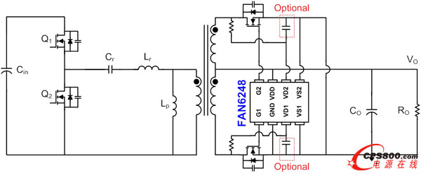 FAN6248具有反擊穿保護特性,確保可靠的同步整流,其獨特的自調(diào)節(jié)死區(qū)時間控制補償寄生電感以保持恒定的死區(qū)時間,而不受輸出負載和雜散寄生電感的影響,這有助于最小化本體二極管導通和最大化能效。輕載時當電容電流足以預(yù)先導通MOSFET時,F(xiàn)AN6248檢測到同步整流器的電流反向。通過增加在輕載條件下的導通延遲,可避免這樣的運行模式,提供安全、穩(wěn)定和高效的工作。FAN6248有一個自調(diào)節(jié)最小導通時間電路,以更好地抗噪。它有兩個同步整流MOSFET門極驅(qū)動,專用的100 V 額定輸入用于檢測各同步整流 MOSFET的漏源電壓。支持達700千赫的高頻工作。節(jié)能模式下的工作電流低,典型值350 uA。工作電壓范圍4.5 V至30 V。10.5 V的高驅(qū)動輸出電壓可驅(qū)動所有MOSFET頻段到最低的導通電阻。圖1所示為FAN6248的典型應(yīng)用電路,在初級端有一個LLC控制器。在次級端,配置非常簡單,包含一個FAN6248控制器和2個外置電阻,在噪聲嚴重的系統(tǒng)中可能需要再添加2個電容。因此,F(xiàn)AN6248是個高度集成的控制器,需要最少的外部元件。