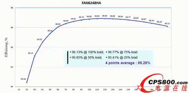 我們對FAN6248進行了能效測試,其中Vin=390 Vdc,Vout=12 Vdc,初級控制器采用NCP1399,滿載時頻率為110 kHz,從測試波形可看到,系統(tǒng)在滿載、75%負載、50%負載和25%負載的4個點的平均能效高達96.29%。
