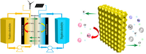 大規(guī)模儲能技術(shù)是實現(xiàn)可再生能源普及應(yīng)用的關(guān)鍵核心技術(shù),液流電池由于具有安全性高、儲能規(guī)模大、效率高、壽命長等特點(diǎn),在大規(guī)模儲能領(lǐng)域具有很好的應(yīng)用前景。全釩液流電池是目前發(fā)展最為成熟的液流電池技術(shù)之一,現(xiàn)處于產(chǎn)業(yè)化示范階段。但該電池仍存在能量密度較低,成本較高的問題。為此,研究團(tuán)隊選擇成本較低的FeCl2和ZnBr2作為活性物質(zhì),構(gòu)建了中性液流電池體系。采用絡(luò)合技術(shù)解決了中性條件下鐵的水解問題,利用多孔離子傳導(dǎo)膜替代傳統(tǒng)離子交換膜解決了由于鐵離子污染導(dǎo)致膜內(nèi)阻升高的問題,提高了中性介質(zhì)中離子在膜中的傳導(dǎo)性,提高了中性鋅鐵液流電池的性能和穩(wěn)定性。該電池在40mA/cm2工作電流密度條件下,能量效率超過86%,連續(xù)運(yùn)行超過100次循環(huán)性能無明顯衰減。該體系活性物質(zhì)濃度可達(dá)2M,其體積能量密度可達(dá)56Wh/L。更重要的是,與其他液流電池體系相比,該體系具有更低的成本(<400RMB/kWh),表現(xiàn)出很好的應(yīng)用前景。該工作對于新一代液流電池的研究開發(fā),具有重要的指導(dǎo)意義。