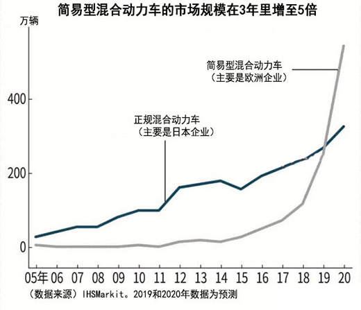 在簡易型混合動力車領域,奧迪和戴姆勒最近數年一直在迅速增加搭載車型。寶馬也打算采用。英國調查公司IHS Markit的資料顯示,簡易型混合動力車的市場規模在截至2018年的3年內增至近5倍。預測稱,到2020年達到539萬輛,增至2019年的2倍以上,超過正規混合動力車的數量。
