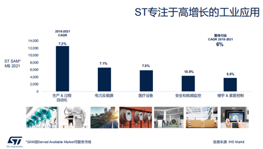 工業市場是增長最快的市場之一。據預測,在諸如制造和加工、電力和能源、醫療電子、樓宇自控等市場,2018至2021年其工業應用復合年增長率將達到6%,而安保視頻監控應用(大部分屬于自動化方面),同期復合年增長率將達19%。巨大的市場增幅,意味著更多的發展潛力,因此,ST將極力拓展這一領域。