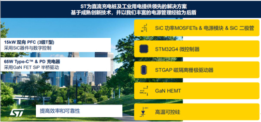 關于在電力和能源市場上的最新行動,ST擬通過創新的直流充電站解決方案,成為市場領導者。為此,ST技術創新中心研發了尖端產品和解決方案,比如采用行業領先的SiC數字控制技術的15kW雙向PFC(3級T型),采用GaN FET SiP的65W Type-C™與功率傳輸充電器。