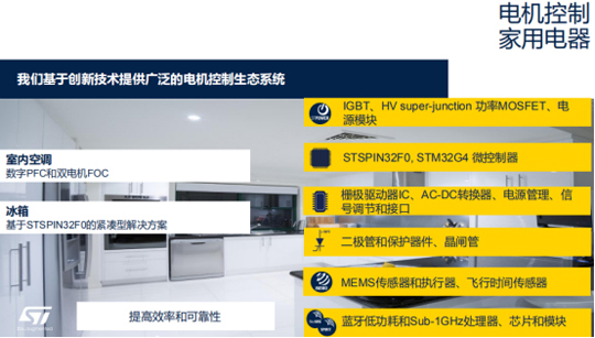 在電機控制方面,尤其是家電市場領域,ST擁有廣泛地解決方案和產品組合。針對空調和冰箱應用,ST推出了數字PFC和雙電機FOC以及基于STSTSPIN32F0的緊湊型解決方案。