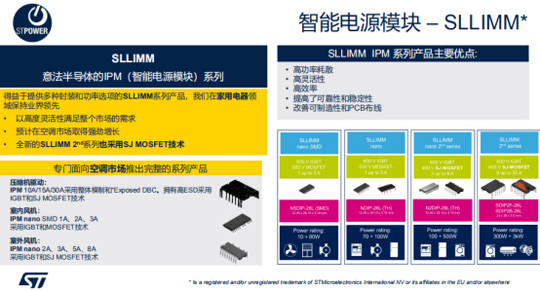 除此以外,Mugger還表示,ST將電動機的功率分為30w、150Kw、250kW,并提供廣泛的封裝來滿足客戶需求。同時,Mugger還指出,當想要縮小方案尺寸并限制空間體積時,ST可以使用多種SLIMM封裝,包括nano SMD系列、SLLIMM nano第二代系列等產品組合。