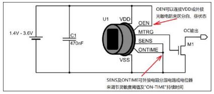 上圖是內置M9401芯片的智能型熱釋電傳感器的最小工作系統,在熱釋電數字探頭內部集成了全新的智能型PIR信號調理芯片M9401。傳感器的靈敏度以及ONTIME的值可以在這兩個引腳上設計電阻分壓器或者是電位器,通過調節這些硬件電路來調整傳感器的不同工作狀態。另外,OEN引腳可以外接光敏電阻來控制傳感器在白天、晝夜的環境中交替工作。相比之前的智能數字探頭,采用M9401芯片的探頭功耗大大降低,同時,其所具備的自檢功能可滿足探頭廠家的半成品自動檢測,節約了后續的檢測工序成本。