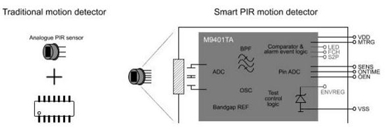 M9401專門為智能式單芯片熱釋電傳感器量身打造,減少了外部單片機及運算放大電路。它具有極小的芯片面積、特殊的輸入、輸出電路結構和片內信號處理能力,可以集成在PIR探頭內部與陶瓷敏感元直接連接,檢測到人體感應并輸出觸發事件。我們稱之為智能PIR傳感器(右下圖),它取代了傳統模擬探頭加外部芯片的分立方案(左下圖)。該智能方案具有高靈敏度、功耗極低、外圍電路配置簡單靈活、高可靠性、抗RF干擾能出眾等優點。基于上述這些優點,該方案在盡可能減少外部元器件數量的同時又能適用于非常寬廣的應用領域。