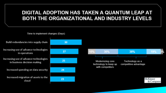 三年前麥肯錫做過調查,當時接受調查的企業高管將“成本的節約”列為企業在數字化戰略中優先考量,但是現在有68%的高管已經將現代化技術作為他們在數字化戰略中的競爭優勢。所以,疫情從某種程度上來說確實是加速了數字化的轉型。