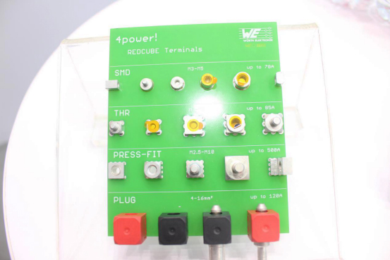 現場伍爾特展示的另一款明星產品就是大電流端子——REDCUBE大電流PCB端子。據魯克華表示,目前市場上大部分大電流線對板連接應用,很多采用的是銅牌,但是銅牌應用于汽車電子等會存在一定隱患,比如在生產組裝過程中,銅牌產生的屑須可能會造成短路,同時由于銅牌本身體積較大,當電流通過銅牌時不一定是平均的,因此產品在使用后會出現局部發熱,進而對產品整體使用壽命造成影響,而伍爾特電REDCUBE產品就很好的規避了上述一些問題,其最大電流可通過500A,該產品目前廣泛應用于新能源汽車、電梯兩大領域。