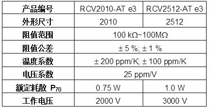 RCV-AT e3系列器件阻值范圍從100 k(到100 M(,公差分別為(1%和(5%,溫度系數(shù)為(100 ppm/K和(200 ppm/K。電阻額定功率為1.0 W,電阻電壓系數(shù)低至25 ppm/V,工作溫度為-55(C至+155(C。