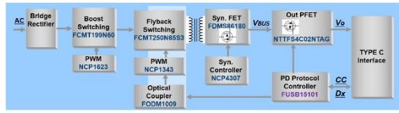 由于電源輸出功率在75W以上,就需要在電路設(shè)計(jì)中增加PFC電路來達(dá)到高功率因數(shù)下的行業(yè)標(biāo)準(zhǔn)。因此,本方案除了采用onsemi旗下新一代QR Flyback控制器NCP1343外,還在電路前級(jí)使用onsemi NCP1623作為PFC級(jí)的控制,提高了設(shè)計(jì)需求。并在輸出控制級(jí)增加onsemi FUSE15101的設(shè)計(jì)滿足了PD3.0/PPS協(xié)議標(biāo)準(zhǔn)。