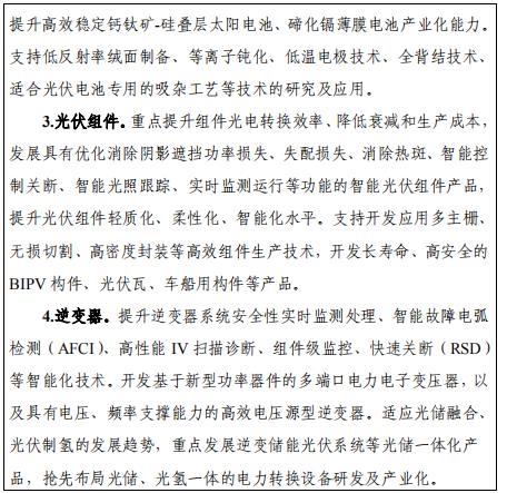 重點發展高效低成本硅片、電池片、組件、逆變器等產業,發展大尺寸、薄片化硅片技術,加快推進隧穿氧化層鈍化接觸(TOPCon)、異質結(HJT)、背電極接觸(IBC)電池技術研發及產業化,開展半片、疊瓦、多主柵、無主柵等先進組件及光伏建筑一體化(BIPV)產品技術研究及應用,突破新型低成本薄膜太陽電池、鈣鈦礦-硅疊層太陽電池產業化技術,發展集電力變換、遠程控制、在線分析、環境自適應等于一體的新型高效逆變器、控制器、匯流箱,鼓勵發展光伏充電寶、穿戴設備、交通工具等移動能源產品。加快延鏈補鏈強鏈,著力引進和培育一批代表性龍頭企業,集聚形成光伏玻璃-電池片-組件-逆變器-儲能系統-發電工程等較為完整的產業鏈,形成以光伏逆變器、電池片、組件企業為龍頭引領,光伏玻璃、邊框支架、儲能系統、系統集成上下游企業為支撐的產業格局。