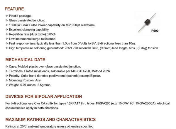 15KPA SERIES大功率瞬態抑制二級管產品詳情