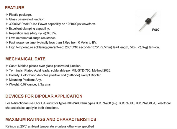 30KPA SERIES大功率瞬態抑制二級管產品詳情