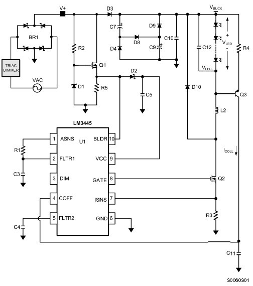 它的無源PFC電路使得電路有更好的效率. LM3445主要用在后配合的TRIAC調(diào)光,固態(tài)照明,