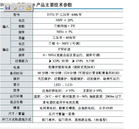 消防)應急電源EP產品名稱:WY系列 產品類別:UPS不間斷電源 >> (消防)應急電源EPS 產品編號:EPS-WY系列 詳細信息:型號 WY1K WY2K WY3K WY5K WY7K WY10K 輸入 電壓 單相220V±25% 三相380V±25%/單相220V±25% 頻率 50Hz±5% 輸出 電壓 正常時:同市電電壓 應急時:220VAC±3% 頻率 正常時:與市電同步 應急時:50Hz±0.5% 波形 正弦波 電池 電池形式 密封式免加水 標稱電壓 48VDC 220VDC 充電時間 <20h 切換時間 <0.25s 應急供電時間 90min(可按需而定) 超載能力 120% 60, 150% 5s 保護功能 欠壓、過流、短路保護 噪音(1m距離) 正常時:無噪音 應急時:<50dB 工作環境 相對溫度 0-90% 環境溫度 -20℃~40℃ 海拔高度 <2000m 適應負載 適用于各種照明負載 輸出回路(標準型) 3 3 3 3 3 3 型號規格 電池配置 應急時間 外形尺寸 重量 輸出回路 安裝 WY1KW 38AH*4 56 560*215*800 80 3 嵌式 掛式 落地式 65AH*4 100 560*215*1200 130 WY2KW 38AH*8 85 600*215*1200 215 3 100AH*4 100 6000*215*1500 230 WY3KW 24AH*8 70 700*215*1200 240 3 落地式 38AH*18 110 750*400*1200 360 WY5KW 38AH*18 65 750*400*1600 410 3 65AH*18 110 750*400*1750 590 WY7KW 65AH*18 75 750*400*1850 650 3 100AH*18 120 750*400*1850 900 WY10KW 100AH*18 90 600*600*2200 960 3 65AH*36 116 800*600*1200 1200 S >> WY系列,WYS系列,產品名稱:WYS系列 產品類別:UPS不間斷電源 >> (消防)應急電源EPS 產品編號:EPS系列 -- WYS系列 詳細信息:型號 WY1K WY2K WY3K WY5K WY7K WY10K 輸入 電壓 單相220V±25% 三相380V±25%/單相220V±25% 頻率 50Hz±5% 輸出 電壓 正常時:同市電電壓 應急時:220VAC±3% 頻率 正常時:與市電同步 應急時:50Hz±0.5% 波形 正弦波 電池 電池形式 密封式免加水 標稱電壓 48VDC 220VDC 充電時間 <20h 切換時間 <0.25s 應急供電時間 90min(可按需而定) 超載能力 120% 60, 150% 5s 保護功能 欠壓、過流、短路保護 噪音(1m距離) 正常時:無噪音 應急時:<50dB 工作環境 相對溫度 0-90% 環境溫度 -20℃~40℃ 海拔高度 <2000m 適應負載 適用于各種照明負載 輸出回路(標準型) 3 3 3 3 3 3 型號規格 電池配置 應急時間 外形尺寸 重量 輸出回路 安裝 WY1KW 38AH*4 56 560*215*800 80 3 嵌式 掛式 落地式 65AH*4 100 560*215*1200 130 WY2KW 38AH*8 85 600*215*1200 215 3 100AH*4 100 6000*215*1500 230 WY3KW 24AH*8 70 700*215*1200 240 3 落地式 38AH*18 110 750*400*1200 360 WY5KW 38AH*18 65 750*400*1600 410 3 65AH*18 110 750*400*1750 590 WY7KW 65AH*18 75 750*400*1850 650 3 100AH*18 120 750*400*1850 900 WY10KW 100AH*18 90 600*600*2200 960 3 65AH*36 116 800*600*1200 1200