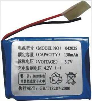 電池型號:AK402025A 容量:130mah 電壓;3.7V 電池厚度:4.0±0.3mm 電池寬度:20.0±0.3mm 電池高度:25.0±0.3mm 電池重量:大約7.8g 保護IC技術參數: 過充電保護電壓4.20V±0.05V 過放電保護電壓2.7V±0.1V 過電流保護 3.0±1.0A(2.7V~4.25V)