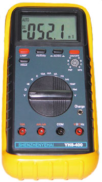YHS-400H數(shù)字萬用表 測量功能:3 4/5 LCD顯示(0.1%) 交直流電壓:0-700V 交直流電流:0-400.0mA 電阻:0-40.00MΩ 電容:0-200.0μF 二極管壓降、三極管放大倍數(shù)、溫度等功能 本機配充電電池及充電器