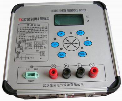 HM2571數字接地電阻測試儀 1、性能特點本儀表與傳統手搖式地阻儀相比,具有以下特點: ·應用了DC/AC變換技術,集三端鈕、四端鈕測量方式為一體,使用電源可以交、直流兩用。 ·采用鎖相環同步跟蹤檢波方式及開關電容濾波器,使抗干擾能力極強。 ·摒棄了傳統的人工手搖發電方式,不須人力做工。 ·不需人工調節平衡,一目了然的面板觸摸鍵操作,LCD數字顯示使得測量十分方便和迅速,消除了指針式儀表的視覺誤差。 ·允許的輔助接地電阻阻值很大,更好的保證了測量精度,分辨率高。 ·除測試接地電阻外,還可測試低壓導體電阻值,土壤電阻率以及交流地電壓。 2、技術指標測量范圍:0~1.999Ω;2~19.99Ω;20~199.9Ω;AC:0~19.99V 恒流值:10mA(2Ω檔);10mA(20Ω檔);1mA(200Ω檔)<±(10%+1d) 測量精度及誤差:0~0.2Ω<±(3%+1d);0.2~199.9Ω<±(1.5%+1d);1~20V≤±(3%+1d) 分辨率:0.001Ω;0.01Ω;0.1Ω;0.01V 輔助接地電阻:Rc:2Ω,20Ω檔<1KΩ,200Ω檔<10KΩ,Rp: <50 KΩ,誤差: <±5% 地電壓:5V工頻有效值5% 功耗:最大≤2W 濕度:≤85%RH 濕度:0℃~40℃ 電源:直流7.2~9V或交流220V 重量:1.8Kg